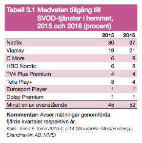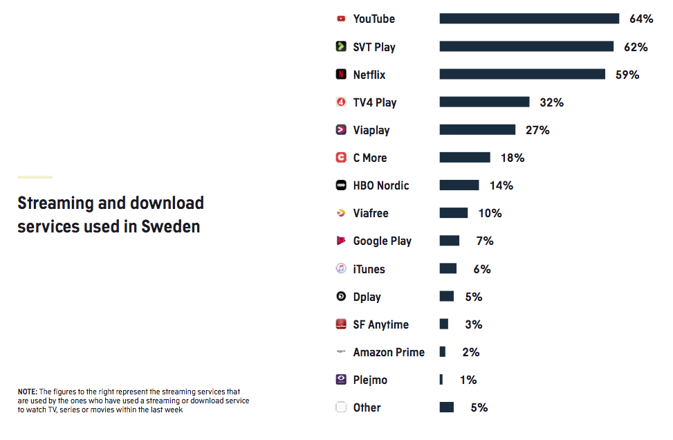 När det gäller strömmad film så är Netflix dominanten i Sverige. 37% av befolkningen anger att de hade tillgång till Netflix år 2016. Veckoräckvidden som redovisas i andra undersökningar uppges vara 59% samma år. Detta kan jämföras med HBO Nordic där motsvarande siffror är 8% respektive 14%. Det gör Netflix cirka 4 – 4,5 gånger så stort som HBO Nordic.
